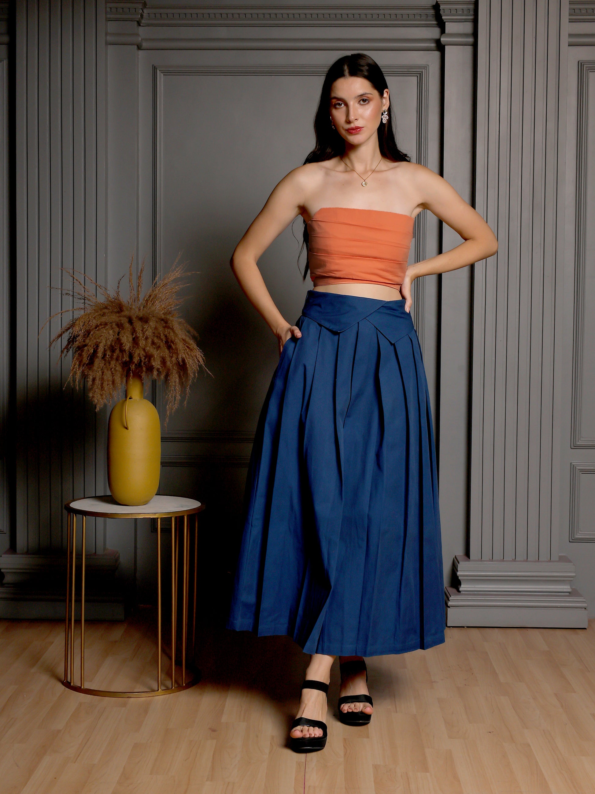 Unveil modern elegance with the Metallic Peach Drape Top & Indigo Flow Set — where fluid femininity meets architectural grace. The strapless, metallic peach top wraps the silhouette in soft gleam, contrasted beautifully by the structured pleats of the deep indigo skirt that cascades like still water. Designed for moonlit affairs and gallery moments, this look speaks in quiet confidence — a portrait of sophistication in motion.